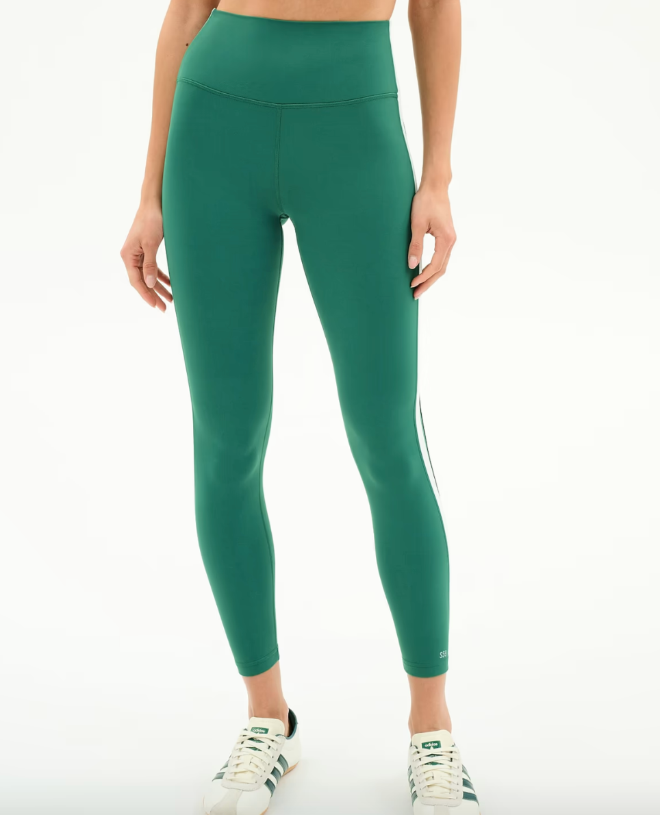 Pops of black and white stripes flow from hip to ankle on this classic black legging. A high waist silhouette and compressive performance fabric shapes and supports. Pair it with the matching Bianca Bra.