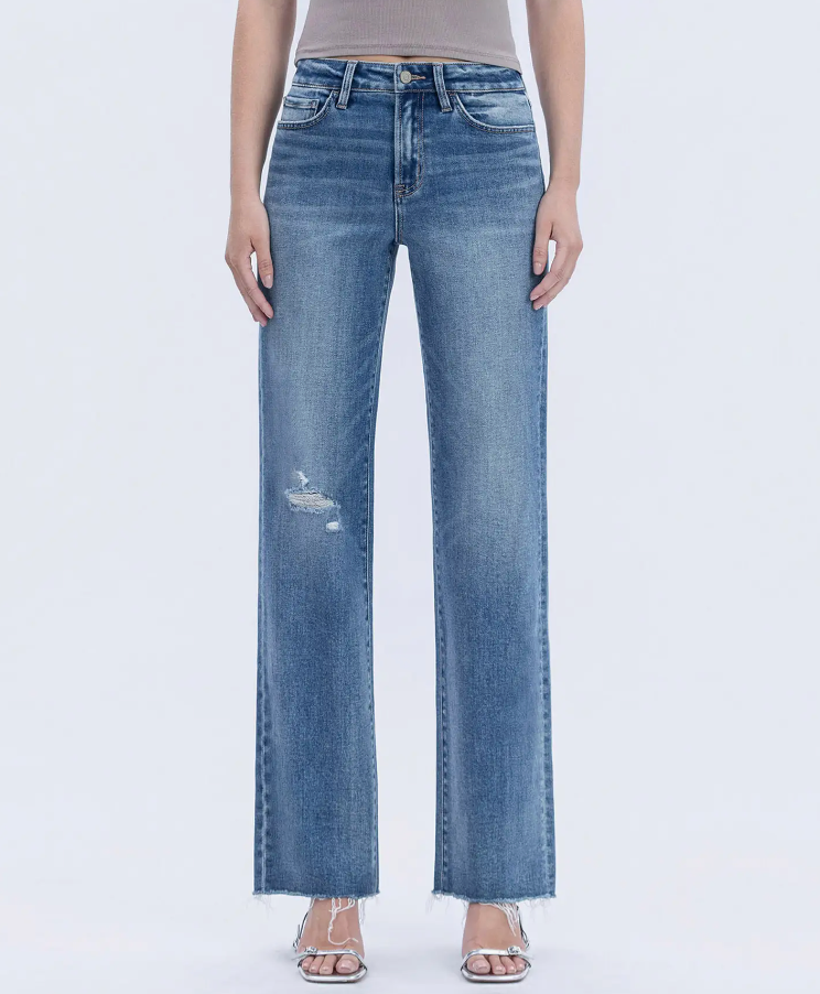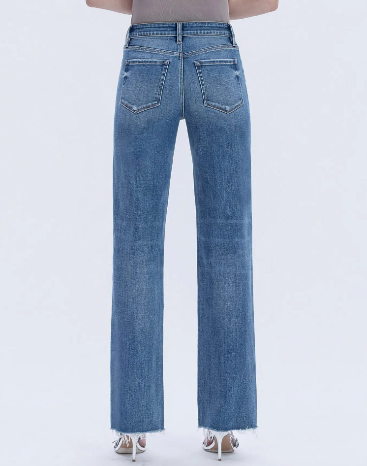 Comfort stretch denim, high rise waist, distressed detail, frayed hem, full length, slim wide jeans