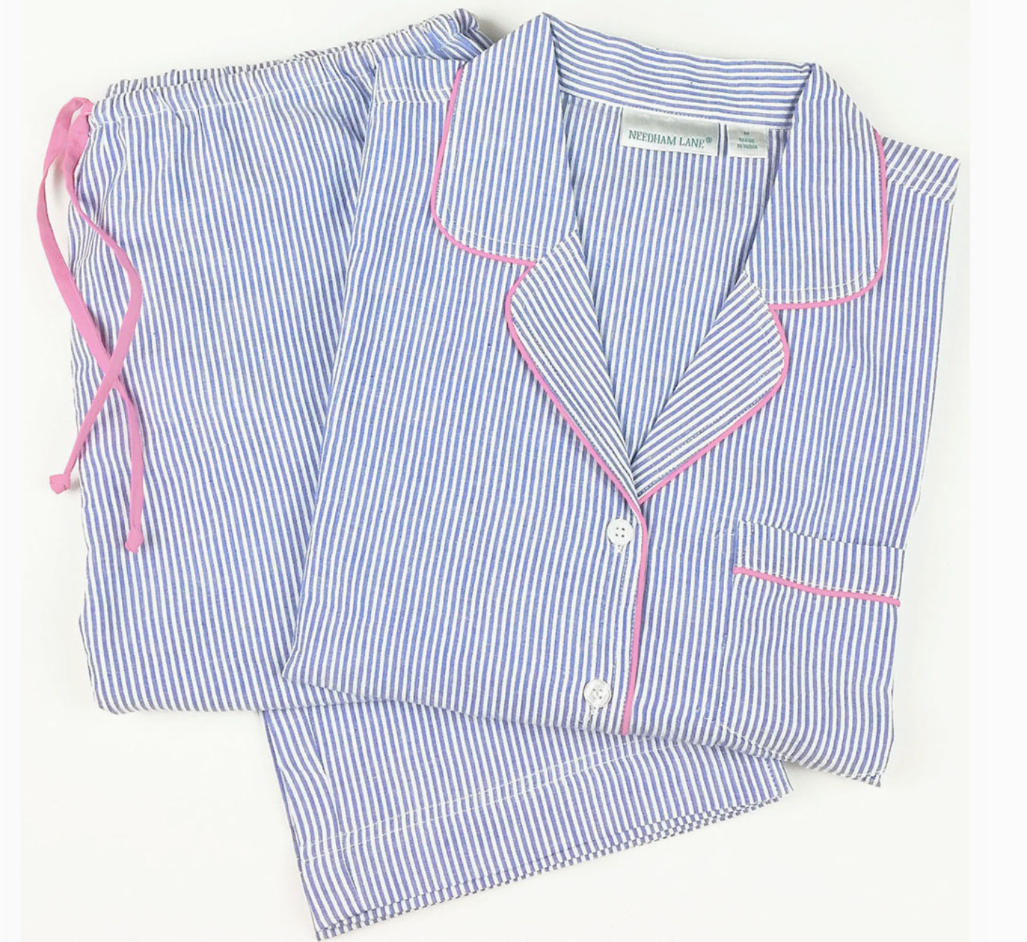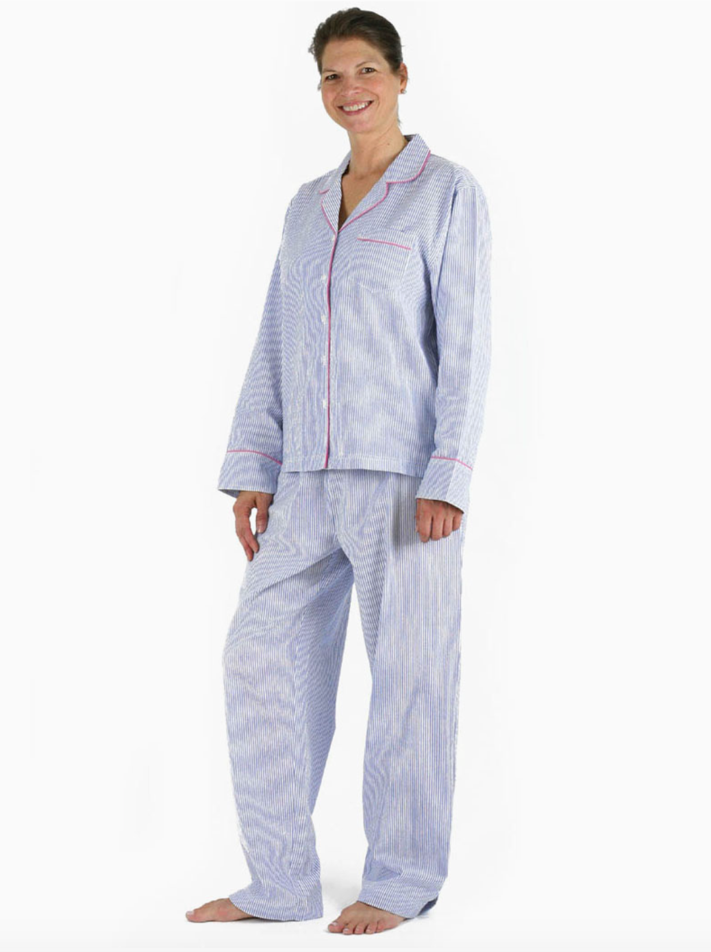 Long sleeve pajama set. Soft, 100% cotton yarn-dyed woven seersucker. Pink & white OR Blue & white striped.  Button-front top with a notched collar, chest pocket and side slits. The full-length pants feature side-seam pockets and elastic waistband with drawstring. Machine wash warm, tumble dry low.