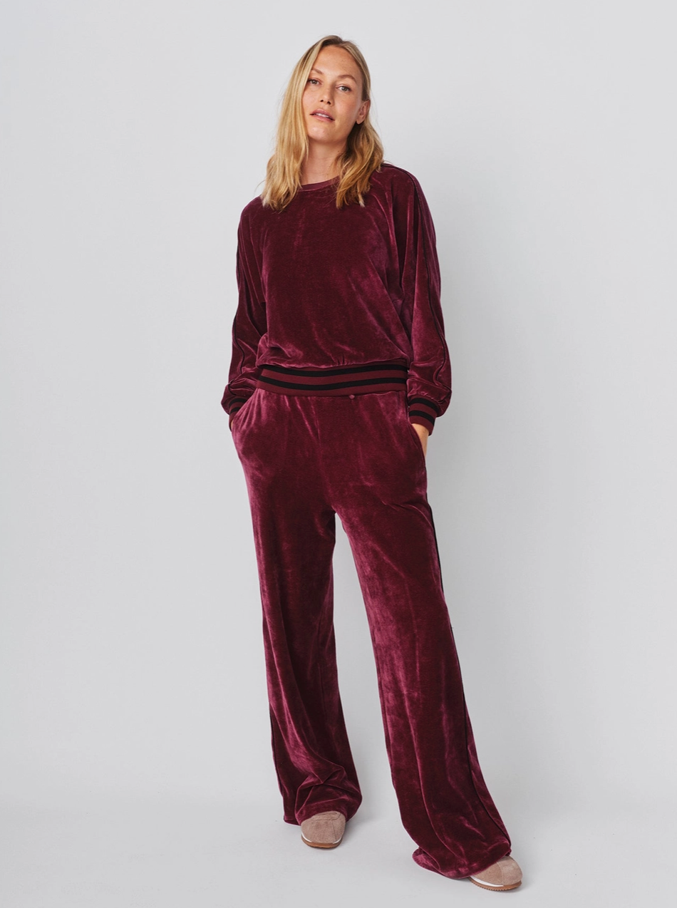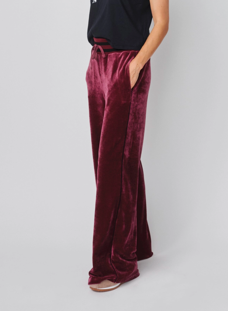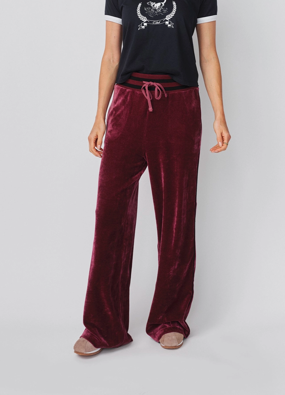 These soft velour trousers feature a relaxed wide-leg silhouette with contrast side stripes for a sporty-chic finish. A striped elastic waistband with drawstring tie adds a touch of vintage flair while keeping the fit comfortable and easy.