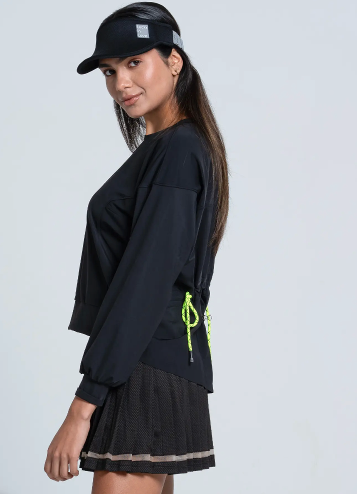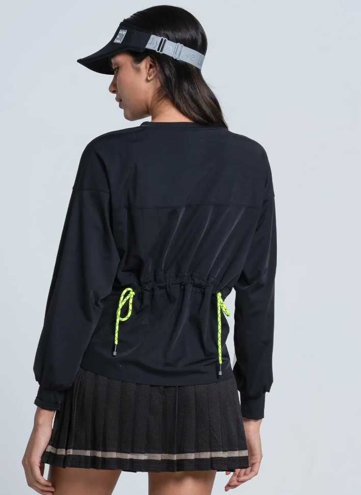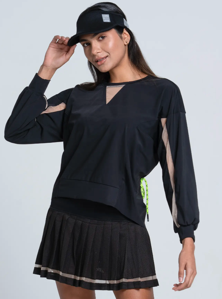 A progressive deconstructed sweatshirt that’s perfect for on and off the court. Featuring tulle mesh inserts, draw cord back and a raw edge hem that come together to create a contemporary design bursting with modern flair.